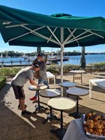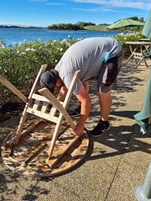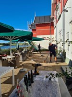 Oldboys hjalp Dyvig Badehotel, en af vore sponsorer, med at pakke møbler fra terrassen sammen.