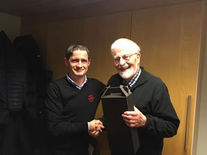 Ved generalforsamlingen modtog Carl Erik Rasmussen (t.h. for formanden Jesper Larsen) fortjente klapsalver og hyldest fra forsamlingen. Carl Erik har revideret samtlige NB regnskaber gennem tiderne og ved fredagens generalforsamling stillede han endnu engang op til en ny periode som revisor.
